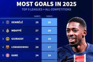 体育资讯5月1日讯 德转列出2025年五大联赛球员射手榜,登贝莱各项赛事25场比赛打进25球居首,姆巴佩第二,莱万、凯恩前五。